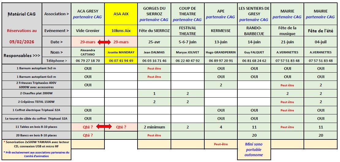 RAPPEL : Le matériel propriété du Comité d'Animation de Grésy sur Aix est exclusivement réservé aux associations partenaires ci-dessus ainsi qu'à la Mairie de Grésy sur Aix pour leurs propres animations et non indirectement pour des structures non partenaires, sauf accord préalable du BUREAU du CAG